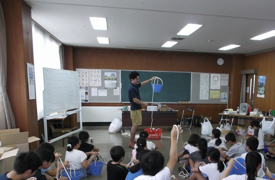 8月17日(土)と18日(日)に、小学生(3年生以上)と中学生を対象とした体験型防災教室が、1泊2日で下野小学校体育館と下野地区市民センターにて開催されました。今後予想される南海トラフ大地震や風水害による大災害に対応できる将来の防災リーダーを育てる体験学習で、子どもたちの企画による子ども目線での体験型防災教室です。参加者は、下野小学校と西朝明中学校の生徒19名で、桑名西高校の生徒の方8名がお手伝いに来ていただきました。