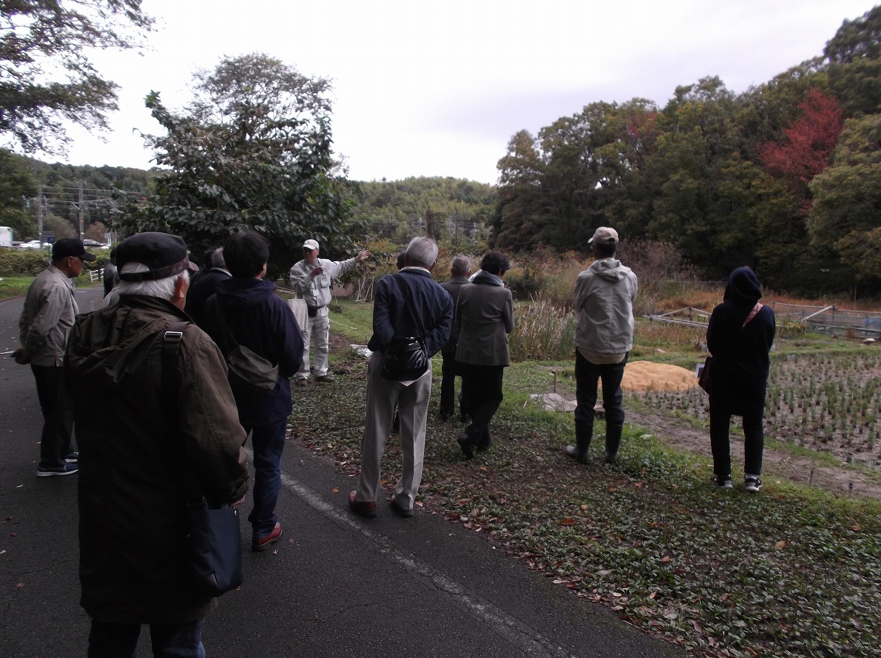 11月14日(木)に、奈良市にあるボランティア団体「奈良・人と自然の会」の中心活動の場所「ならやまベースキャンプ」の保全活動の様子を視察研修に行きました。平成13年9月の設立で、会員数は現在約170名だそうです。活動面積は、16ha(県有地)と広大な活動範囲で、里山の景観づくりや復元した農地で有機農法の実践等の活動を行っています。