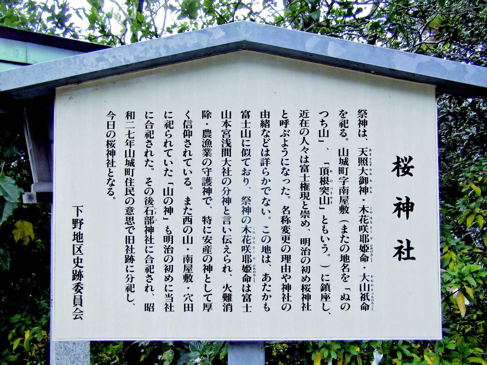 山城町字南屋敷(「ぬのつち山」、「頂根突山」ともいう。)に鎮座し、古くには近在の人々が富士権現と呼んで崇めていたが、明治の初めに櫻(桜)神社に改称された。