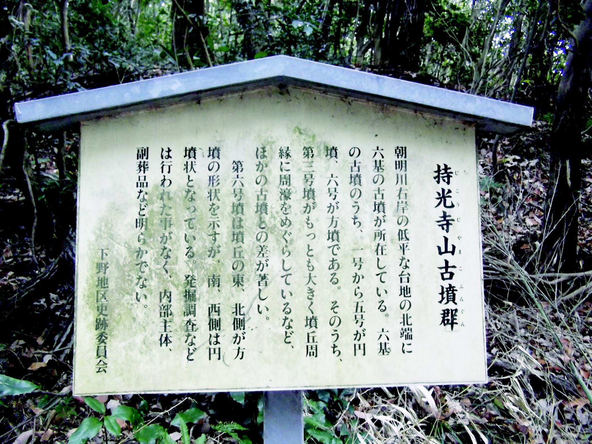 下野地区の名所 持光寺山(じこうじやま)古墳群(朝明町) 2020年1月15日 2020年7月11日 TadaNatsuhiko 朝明川右岸の低平な台地の北端に6基の古墳が所在している。 6基の古墳のうち、1号から5号が円墳、6号が方墳である。 そのうち、第3号墳がもっとも大きく墳丘周縁に周濠をめぐらしているなど、ほかの古墳との差が著しい。第6号墳は墳丘の東、北側が方墳の形状を示すが、南、西側は円墳状となっている。 発掘調査などは行われたことがなく、内部主体、副葬品など明らかでない。 Post Views: 286 Facebook postはてブLINEPocketFeedly