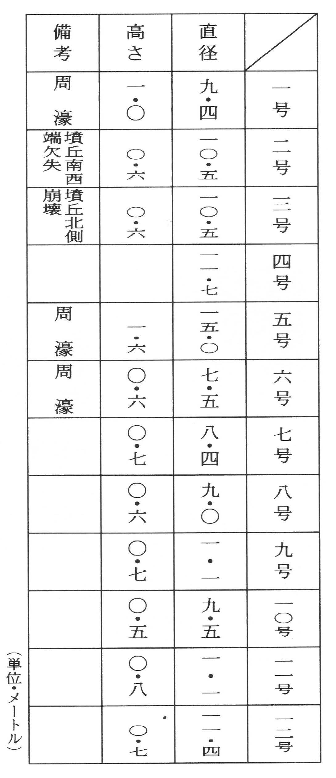 第5号墳が直径15m、高さ1.6mと最大の大きさを示し、墳丘裾の東、西、南に周濠の浅い凹みをもつなど、ほかの墳形に比して特異な形をしているが、北側が崩壊している。