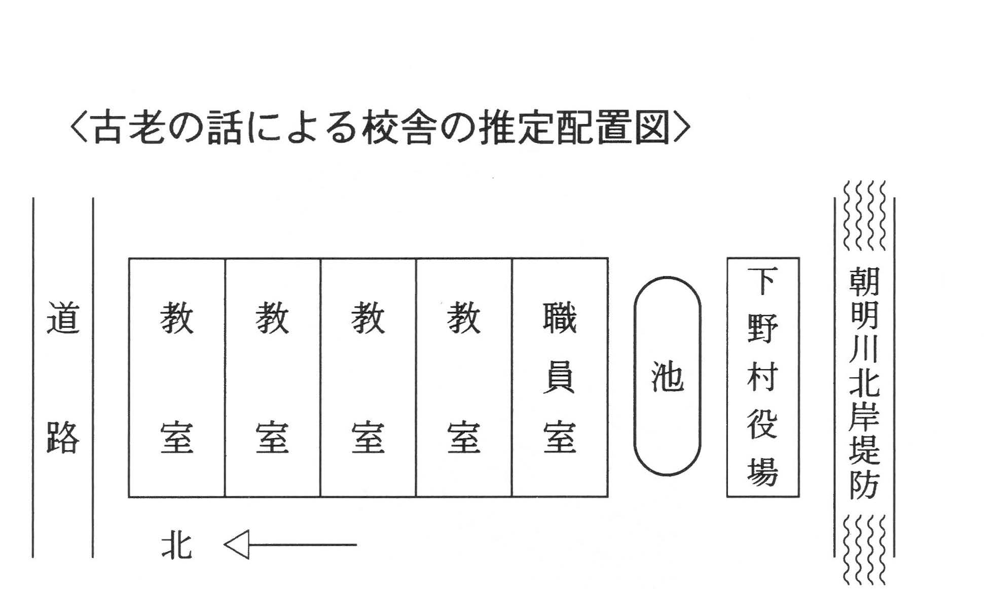 当時通学していた古老の話によると、朝明川堤防下に役場があり、小さな池をはさんで校舎が建てられていた。