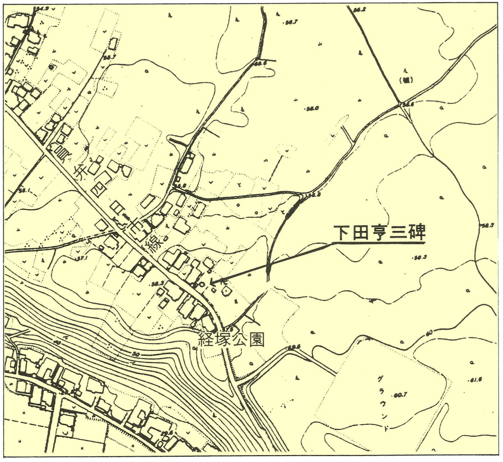 初代の下野村の村長に就任して以来37年の間、村長として村政のために尽くした下田亨三の彰徳碑は、生前(大正14年(1925))に村が経塚公園内に建てたものである。