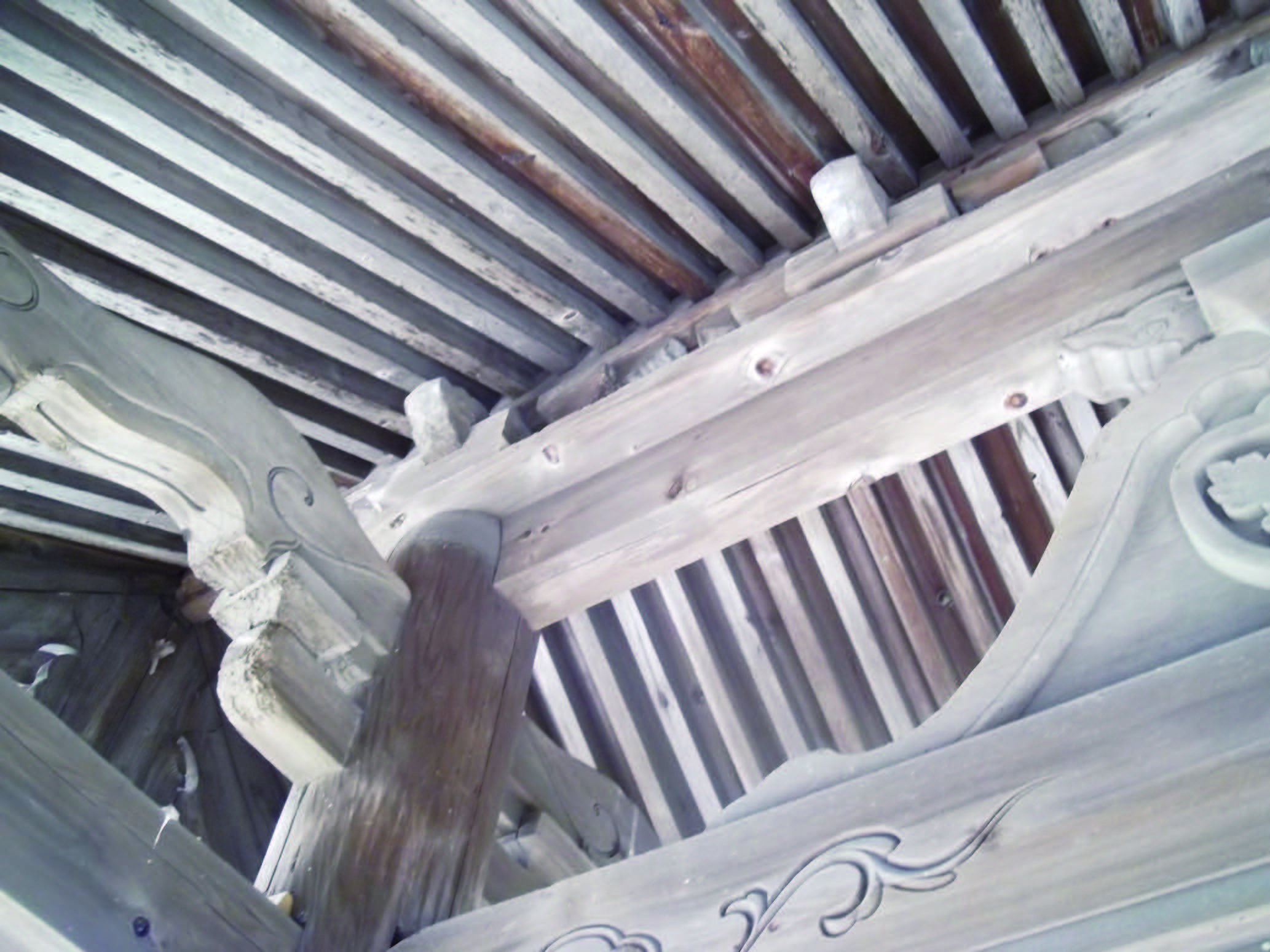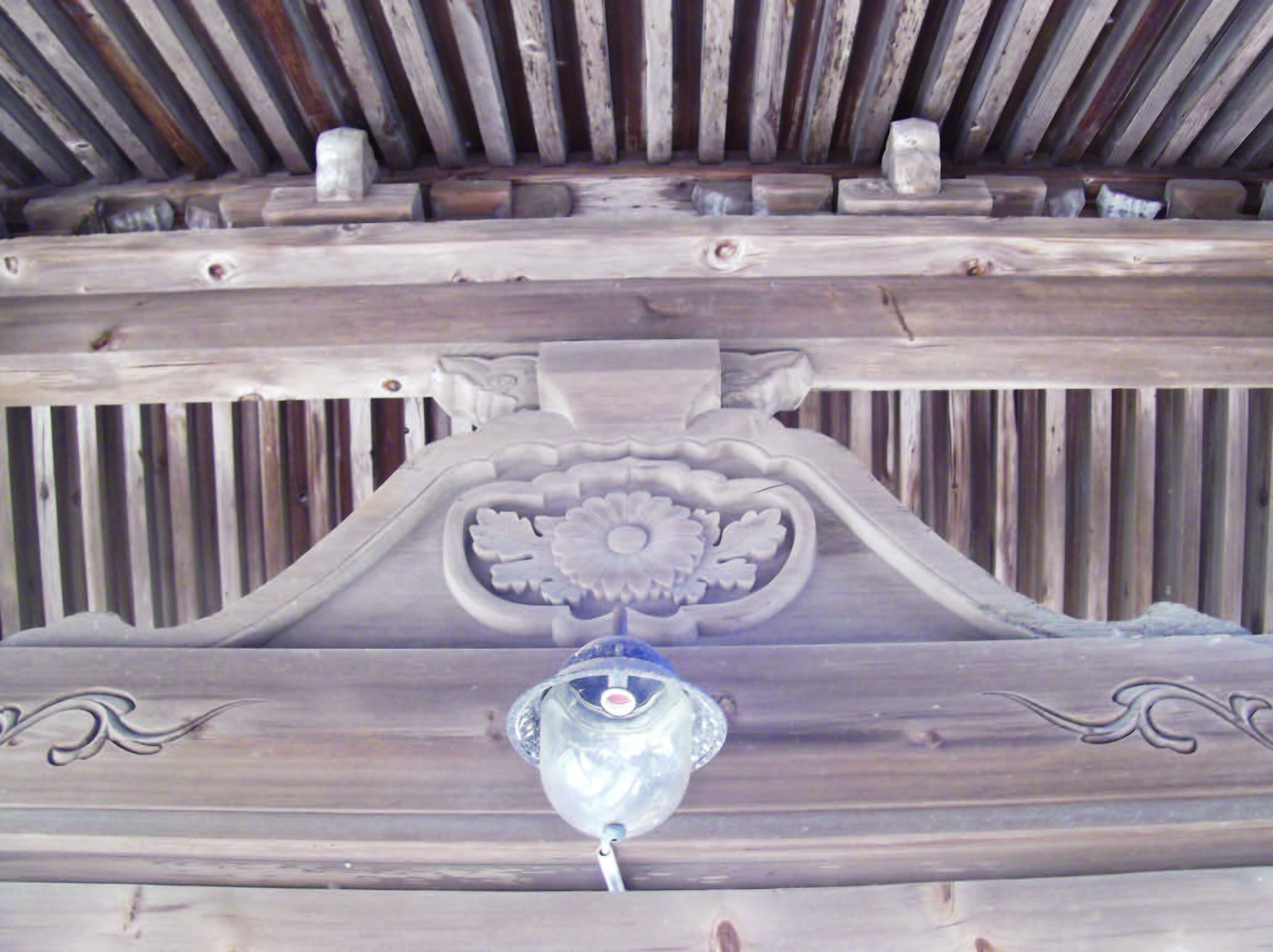 主柱は円柱、控柱は粽付の面取角柱で、柱は全て礎盤の上に建っている。主柱は棟木近くまでのびていて粽付の柱を桁行方向に頭貫と台輪で固め、上は左右に拳鼻のついた三斗組実肘木付を配して化粧棟木を受け、また、控柱の上組物も三斗組実肘木付で頭貫は先端を木鼻につくり虹梁形の錫杖彫を付け、梁行方向のもは飛貫・腰貫とともに主柱とつないでいる。頭貫先端木鼻などの木も太く、繰形絵様の顰のない鎬は古い様式のものといわれている。