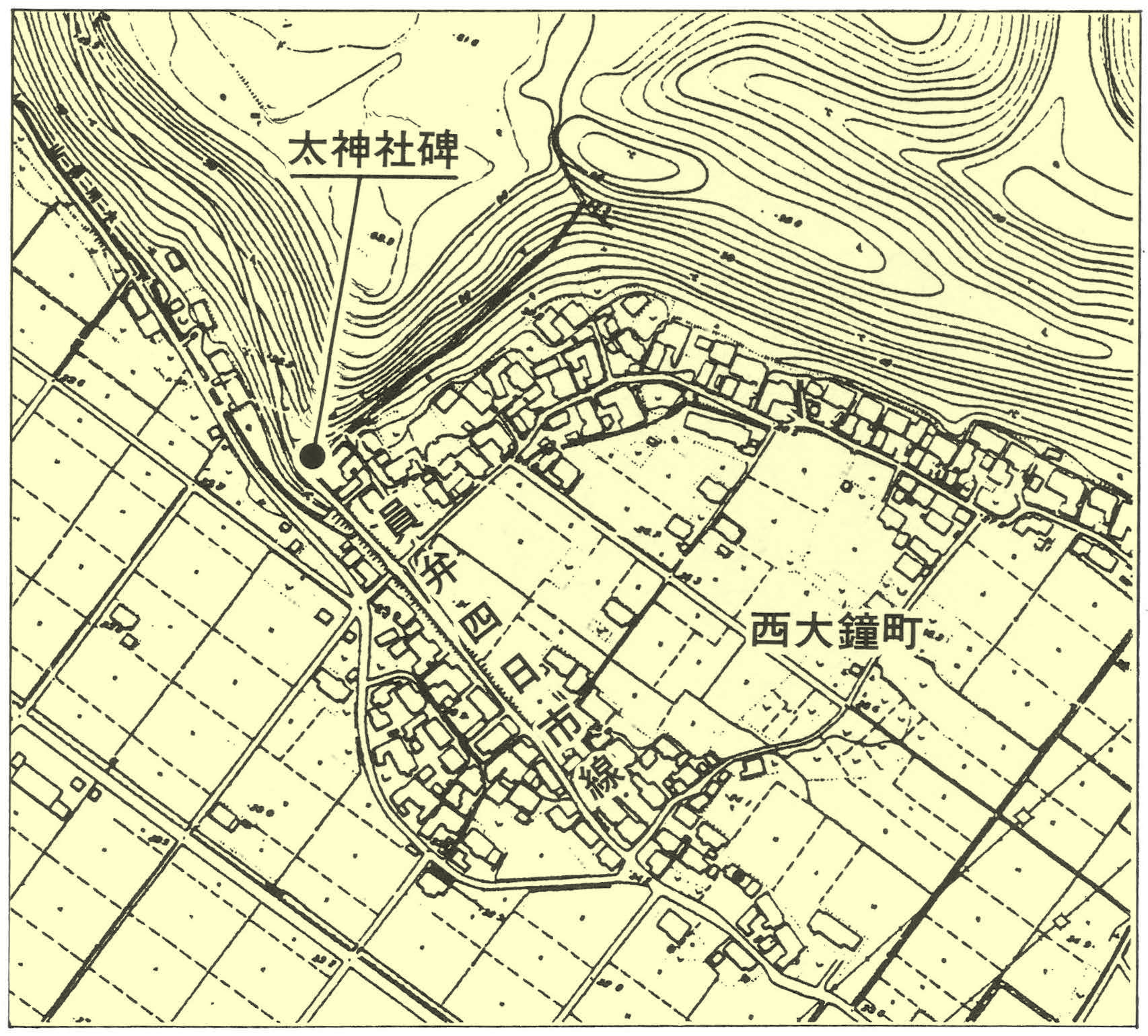 この碑に刻まれた「延喜式内太神社」は、東大鐘(大鐘町)と西大鐘両村の村社として、大正5年(1916) 2月に石部神社に合祀されるまで東大鐘村字大坪に鎮座していた。