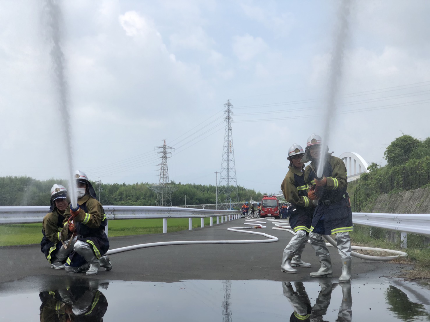 今回は1班6人を2班作り、各班で遠距離放水と2線目も消防車から取り、同時に放水を行う訓練を行いました。