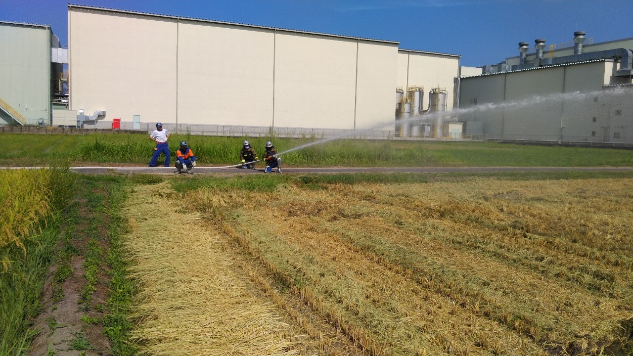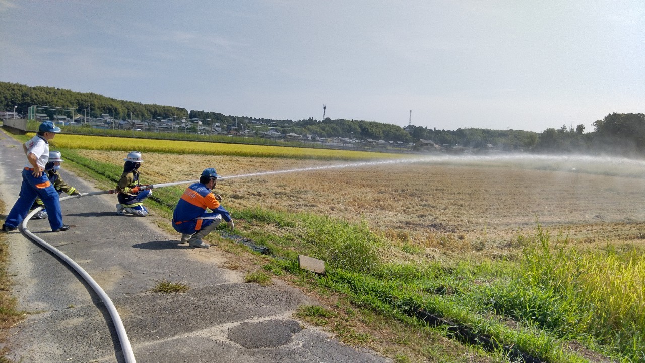 今日の訓練は岩田板金さんの倉庫と田んぼをお借りしました。今回は2箇所の田んぼに幾つか的を設置し、放水にて打ち落とす訓練を行いました。