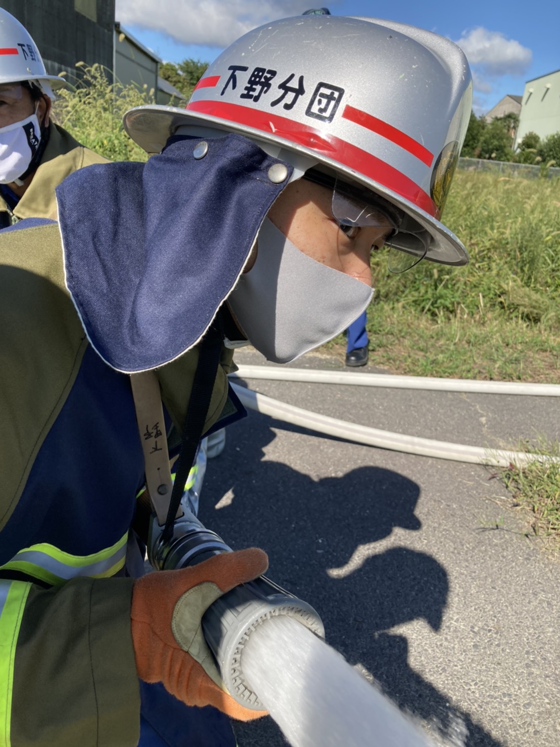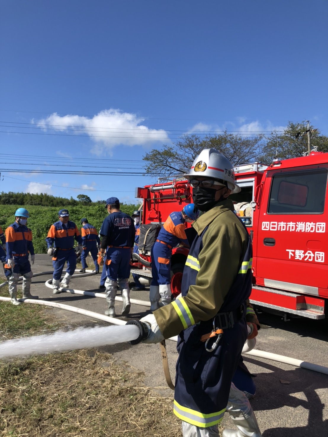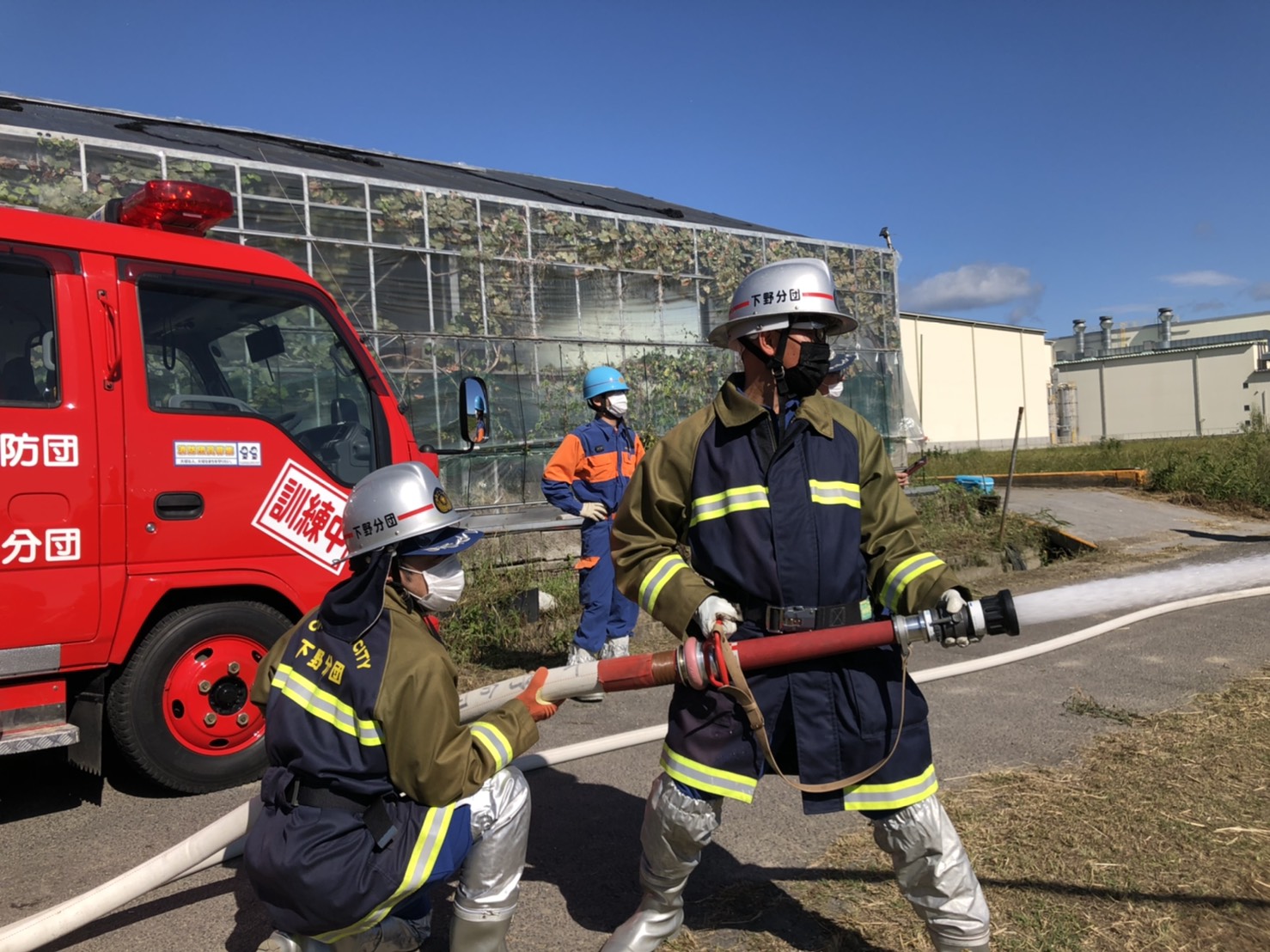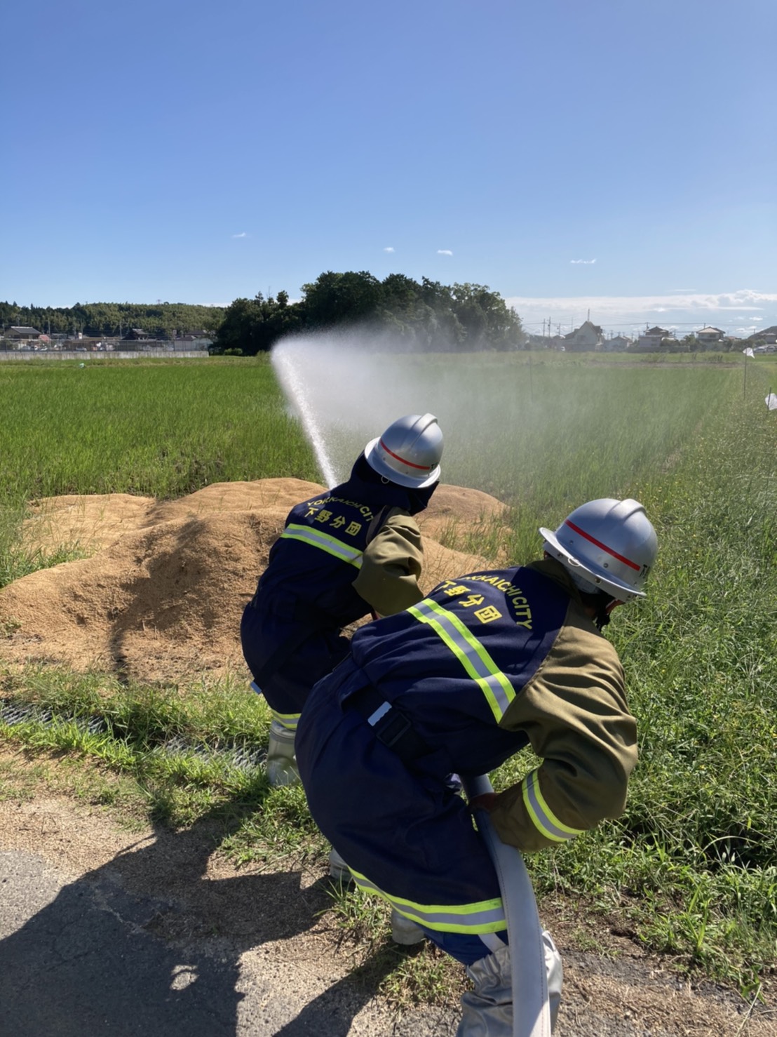岩田板金さんの倉庫と田んぼをお借りし、田んぼに設置した的とコーンを火点と想定し、放水訓練をしました。