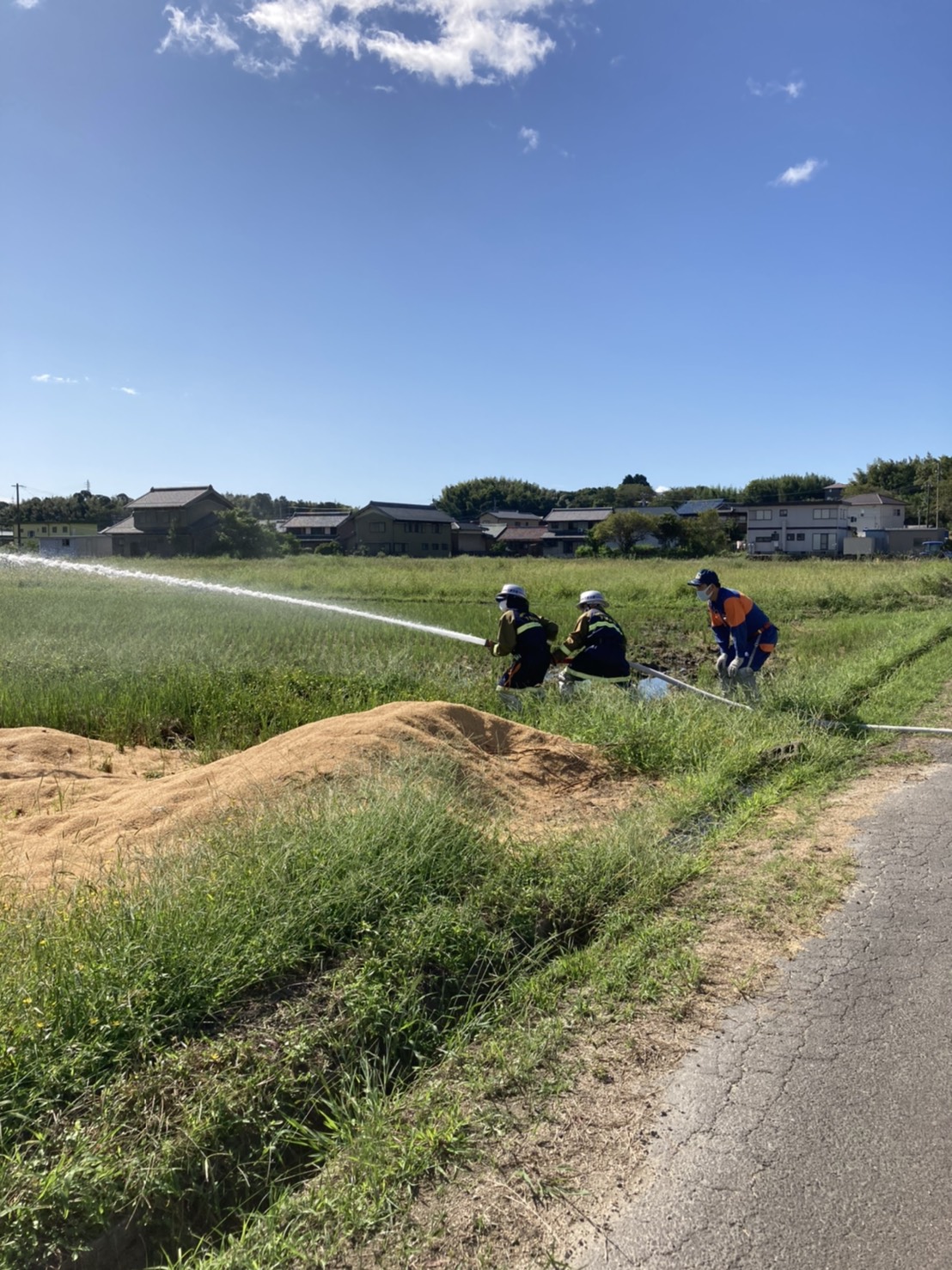 3箇所の田んぼに設置してあり、始めに消防車から近い2箇所の放水を行い、3箇所目は少し離れた場所なので、ホース延長を行い放水しました。今回のホース延長には、あらかじめホースを畳んでバックに入れて、走りながら延長が出来るホースバックを使用しました。