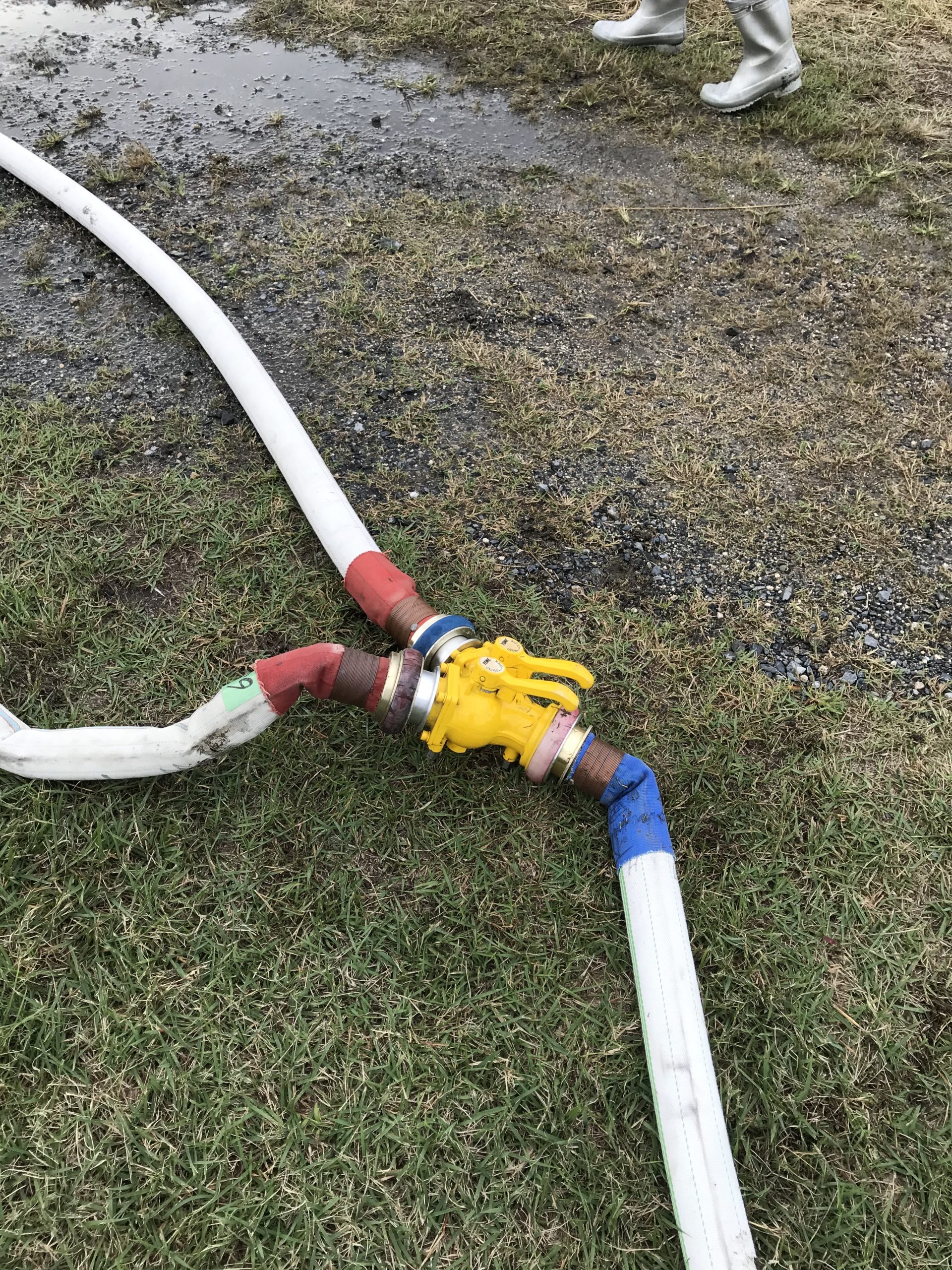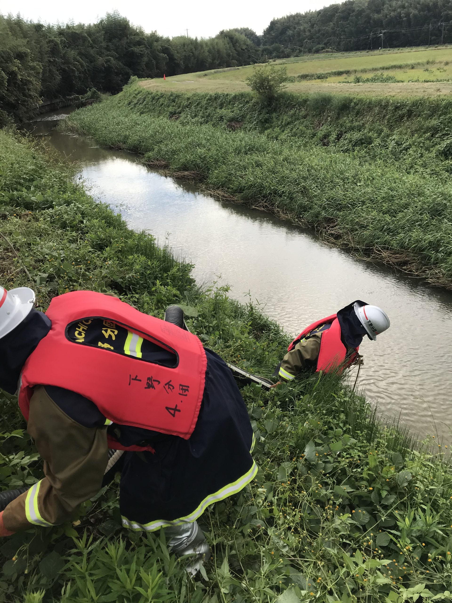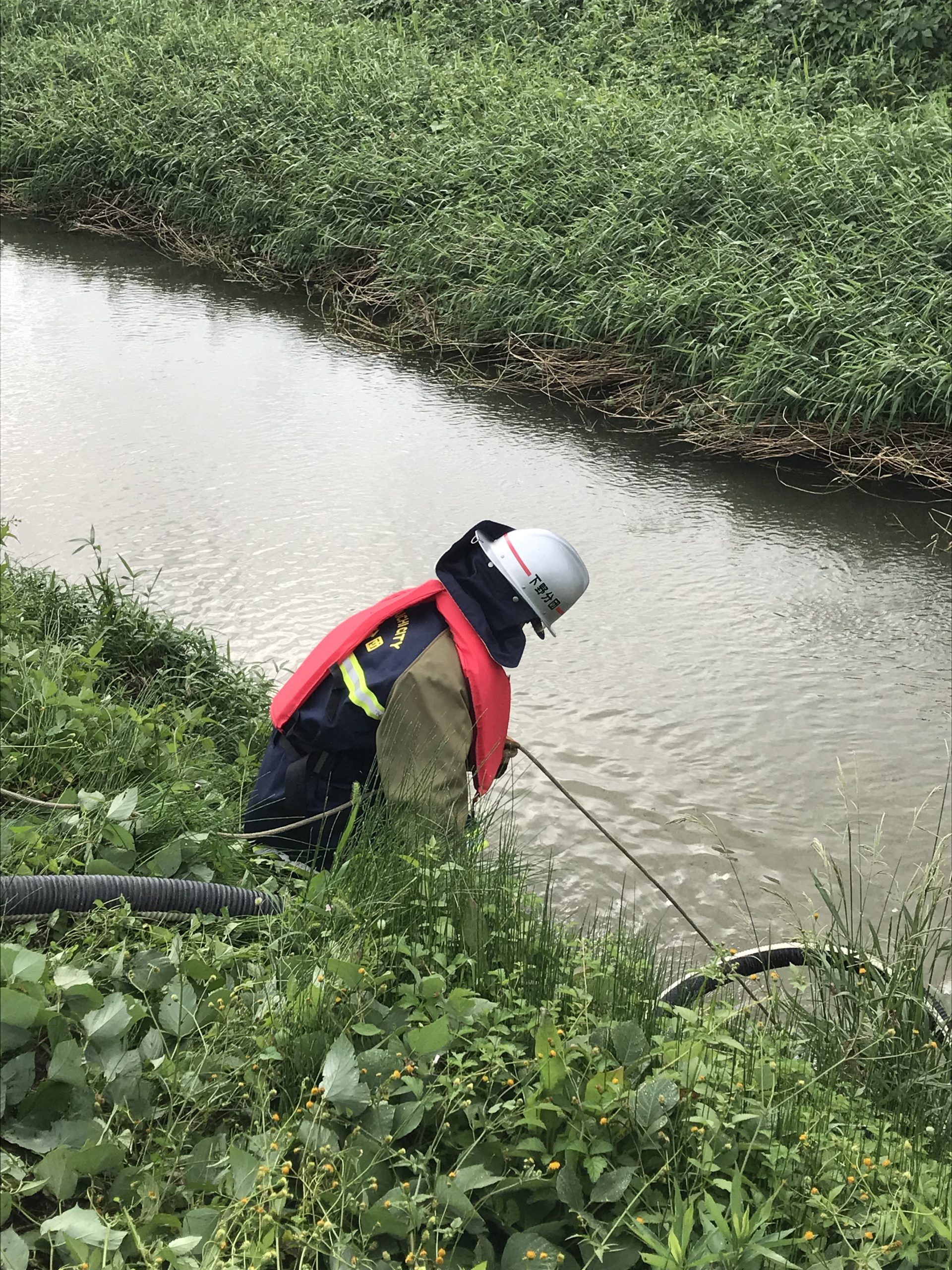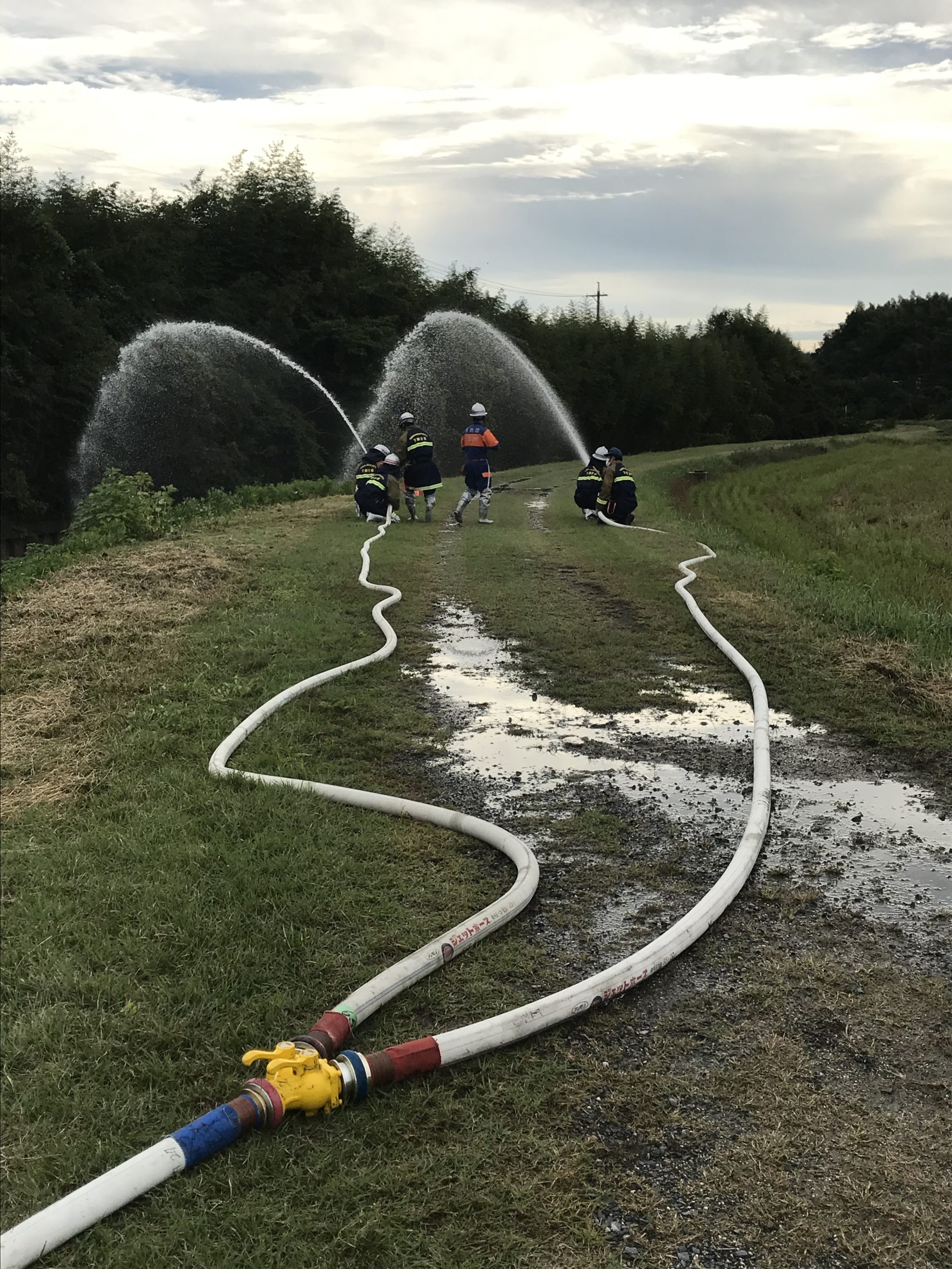 今回は実際に火災が発生した事を想定して出動〜消火活動までを人選されたメンバーが火点や現地状況を見て判断し、行いました。川を挟んでの状況の為、対岸からロープを投げホースに結び、受け取る方法を使いました。