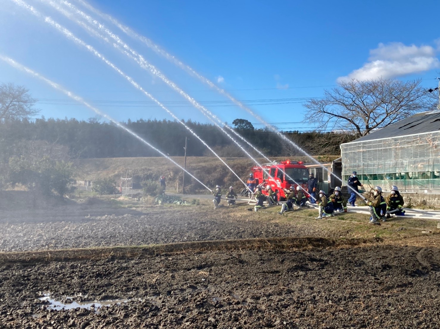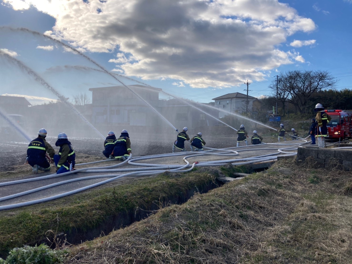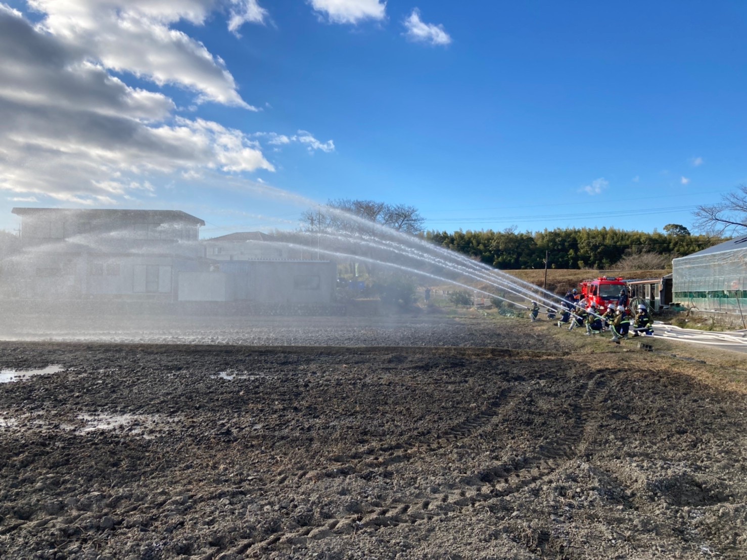 今年初めての訓練は岩田板金さんの田んぼをお借りして送水訓練を行いました。