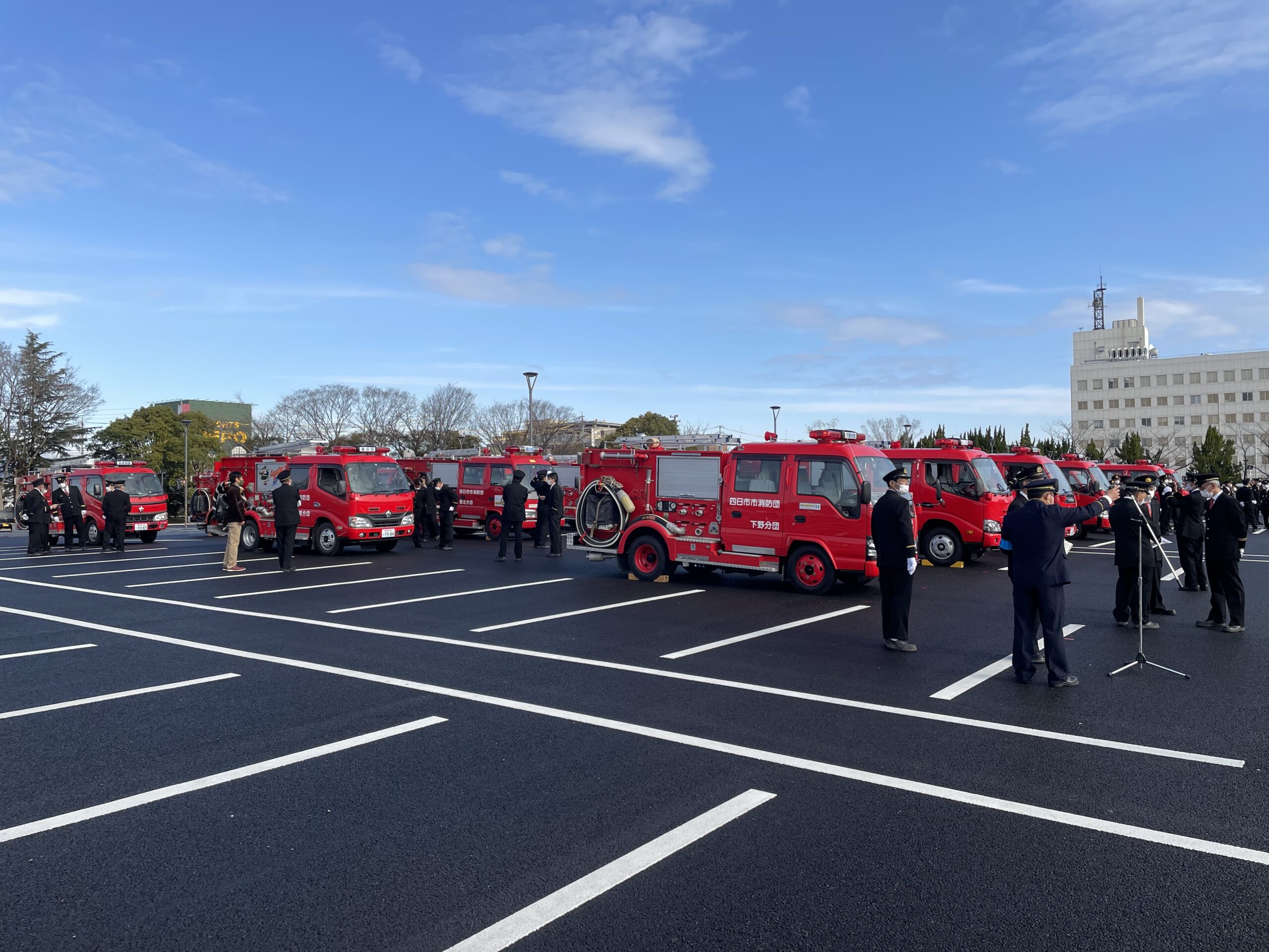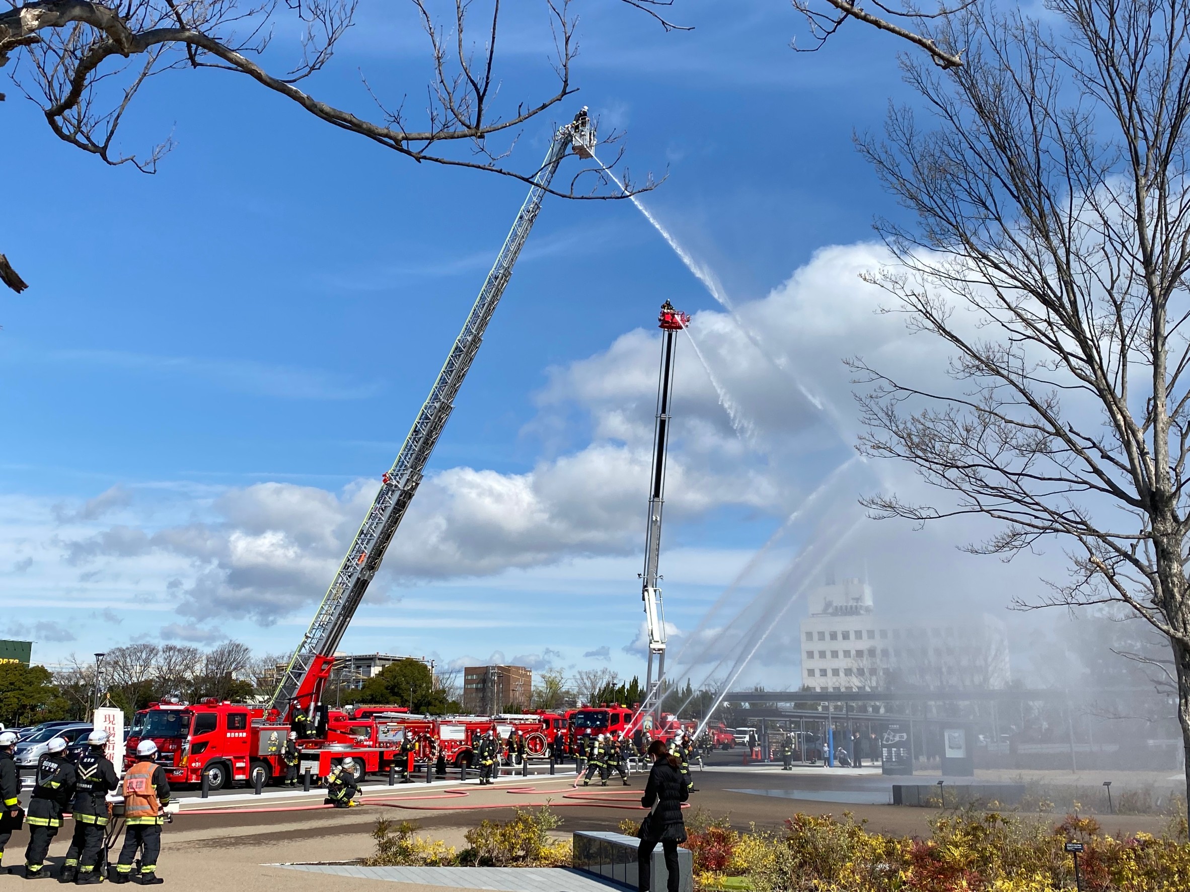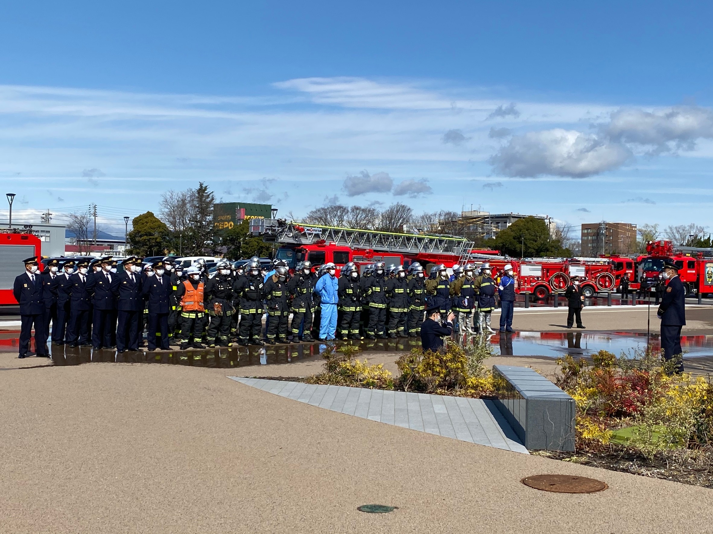 本日は1月に中止となった出初式の代わりに、市長観閲式及び表彰式と特別消防訓練が中央緑地公園にて行われました。