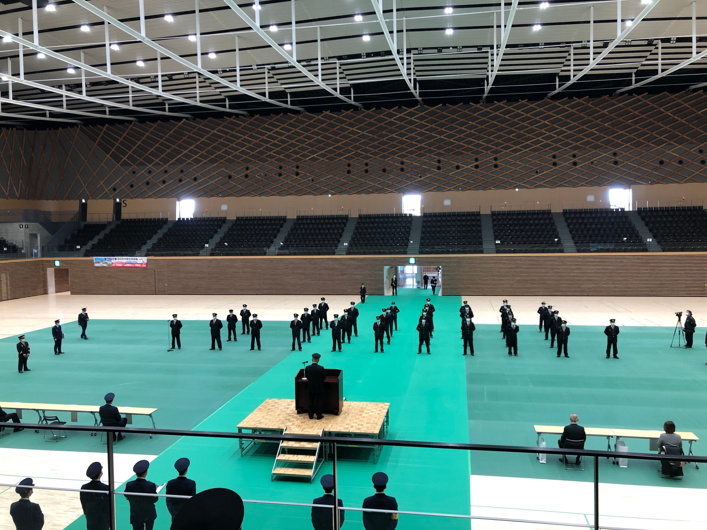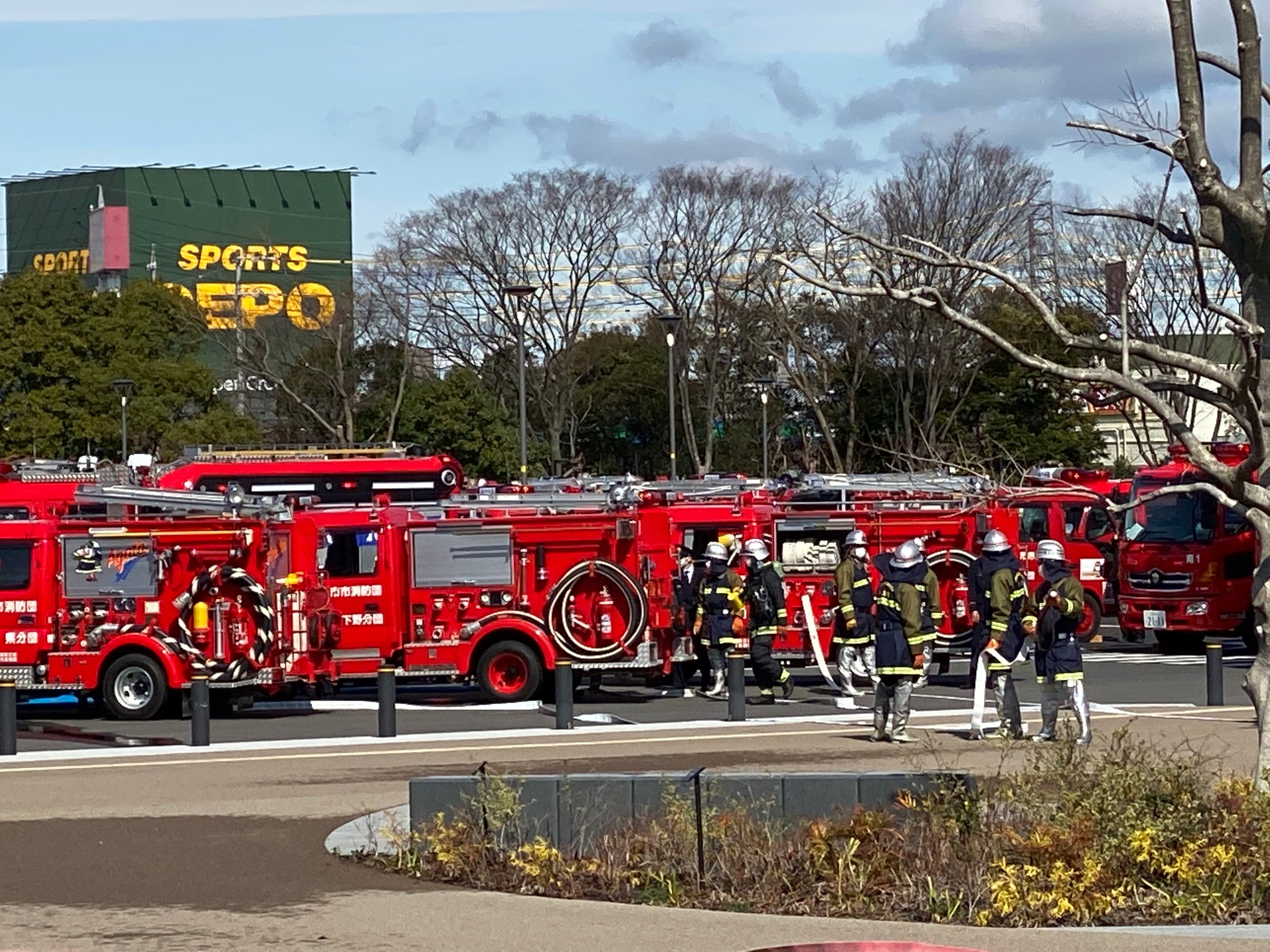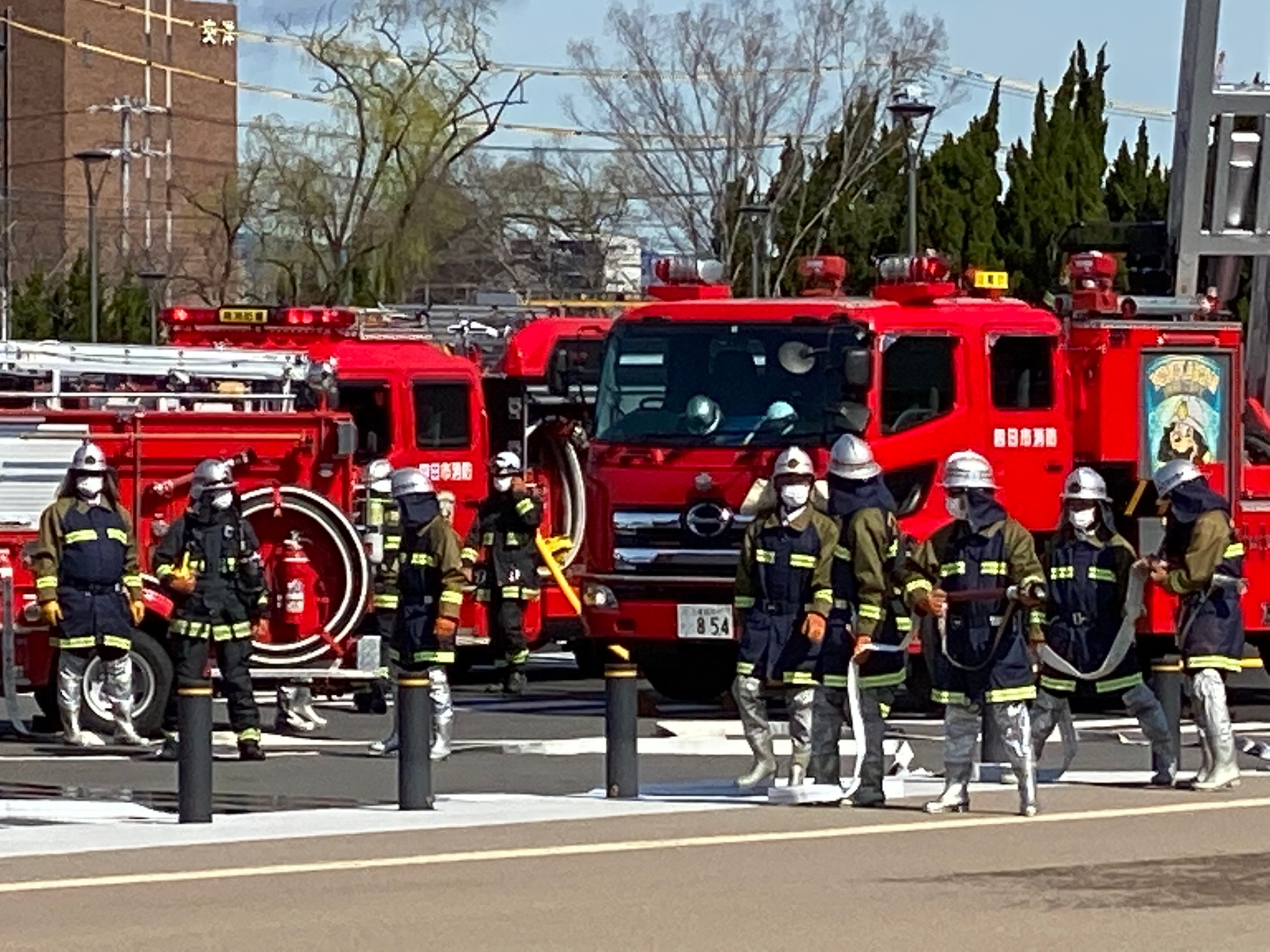 本日は1月に中止となった出初式の代わりに、市長観閲式及び表彰式と特別消防訓練が中央緑地公園にて行われました。
