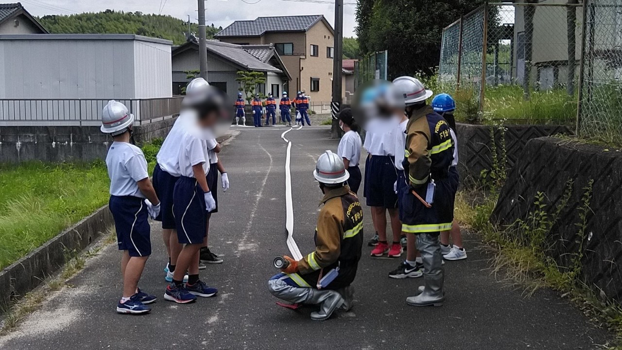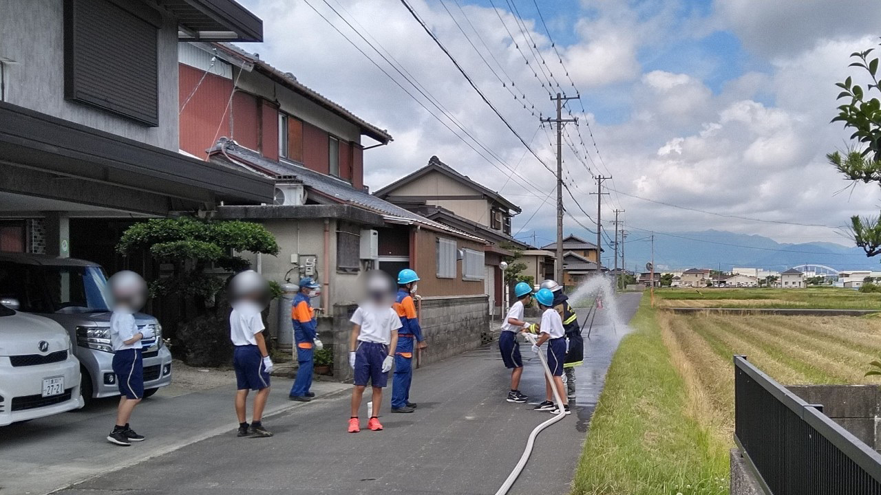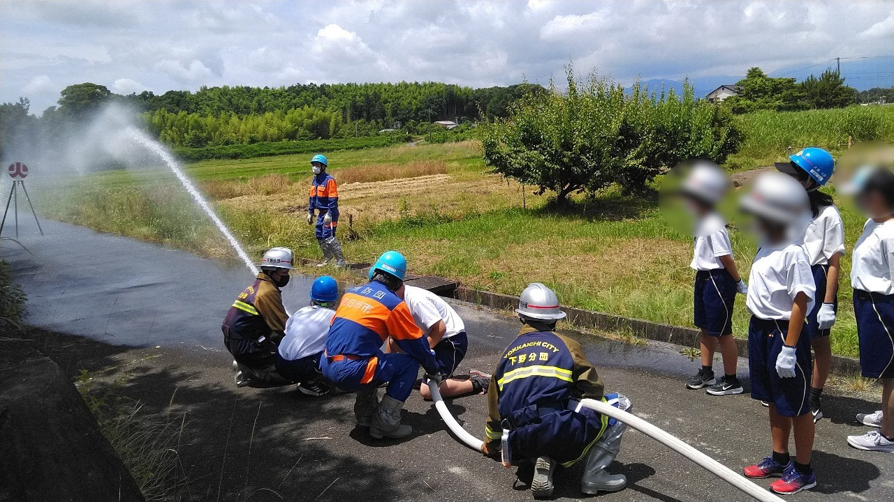 消火栓の蓋の開け方からホースの伸ばし方や接続のやり方といった一連の流れを説明し、その後団員が補助に入り、実際に水を出しての放水を生徒さんに体験していただきました。