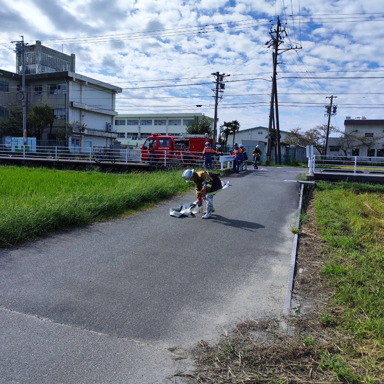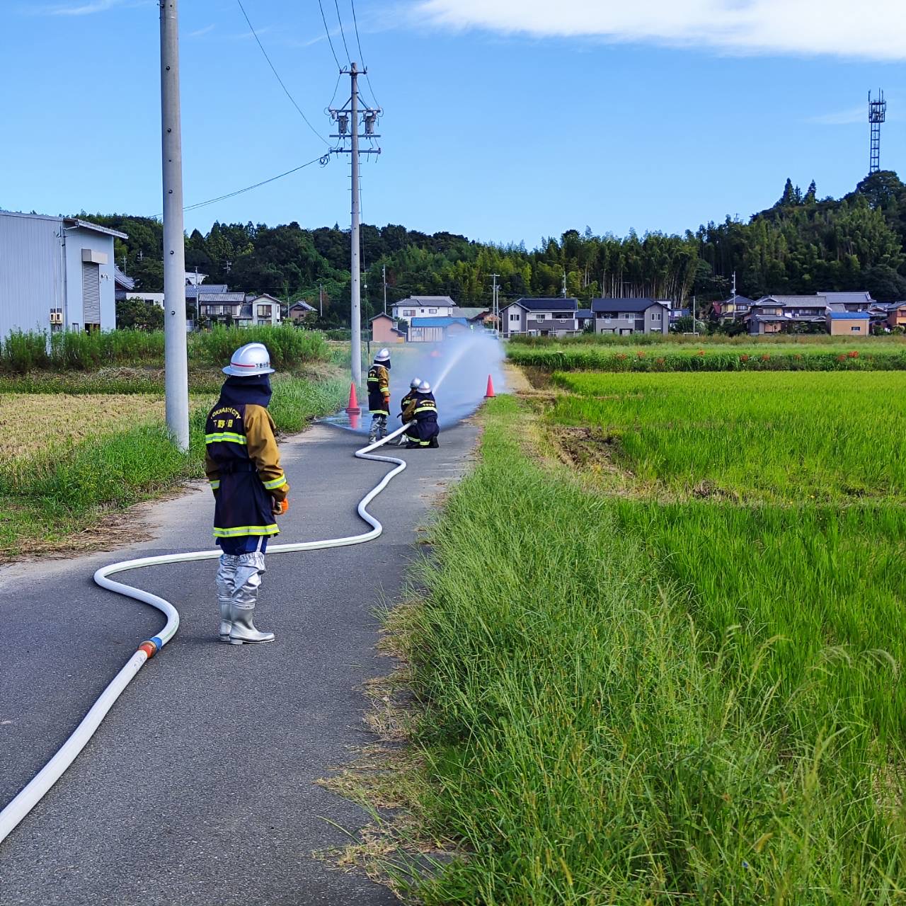 本日、北山町にある朝明新川にて新入団員を中心に出動から放水までの訓練を行いました。