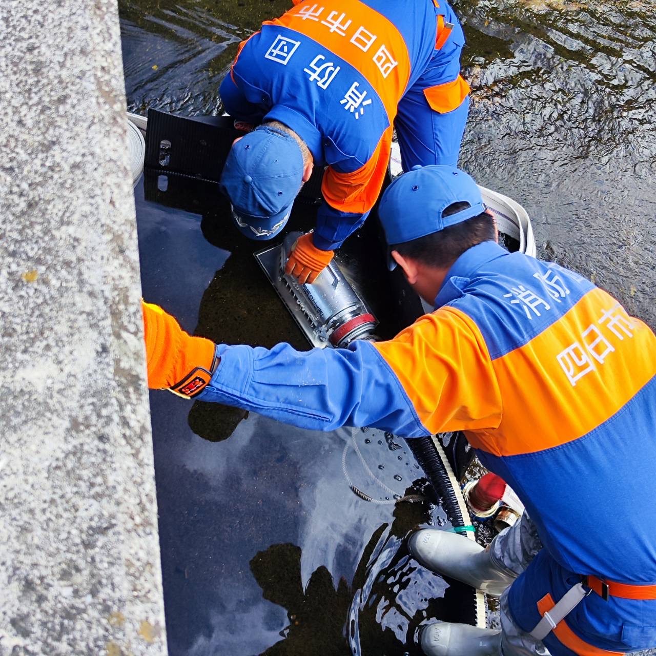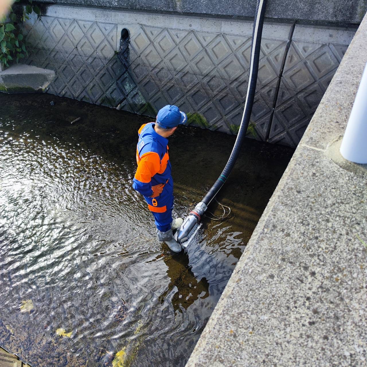 今回、新川の水位が低く、普段使用している吸管では揚水が難しく、消防車の真空がかからない為、低水位でも揚水が可能になる低水位ストレーナーを使用して揚水を行いました。