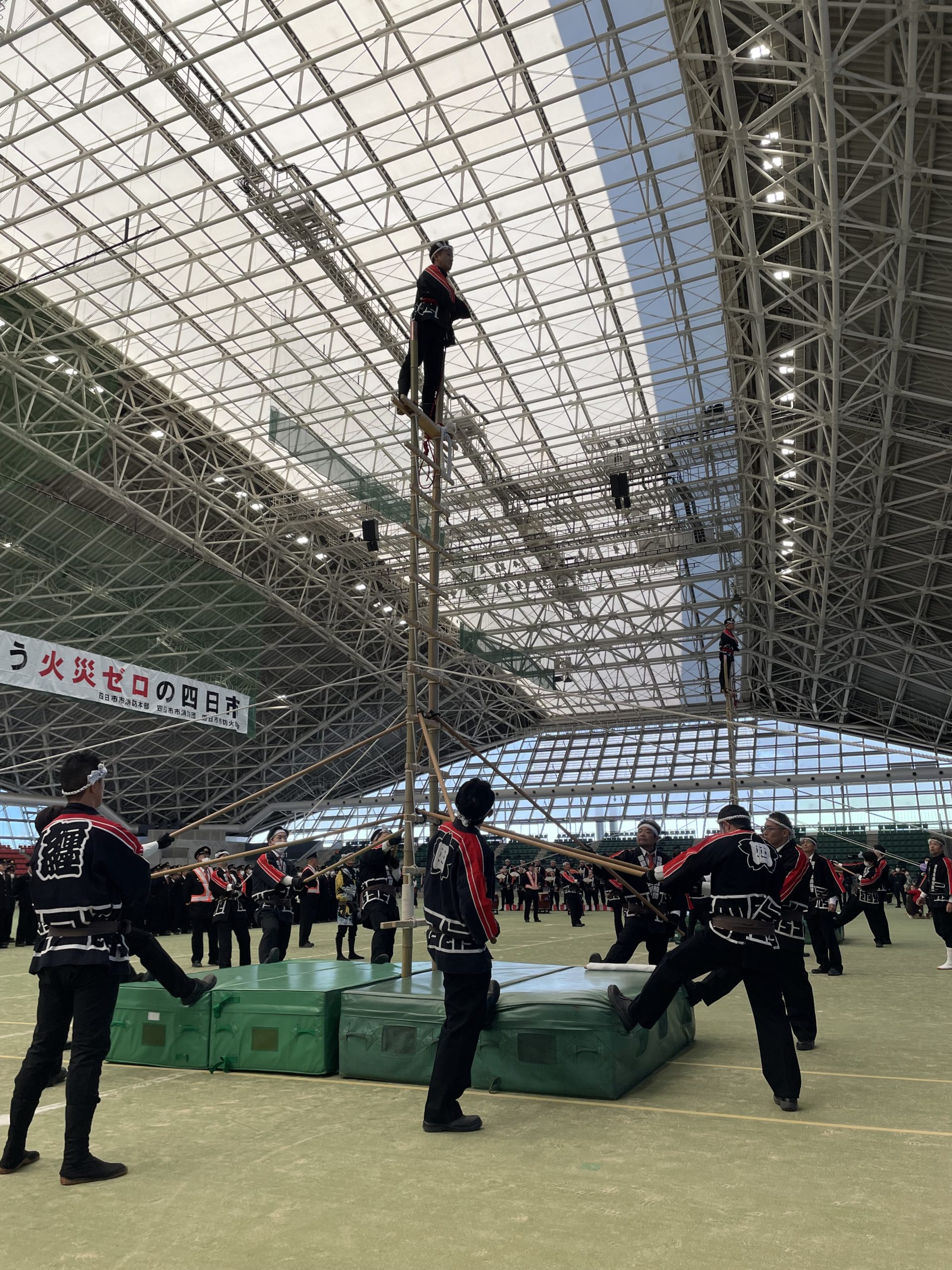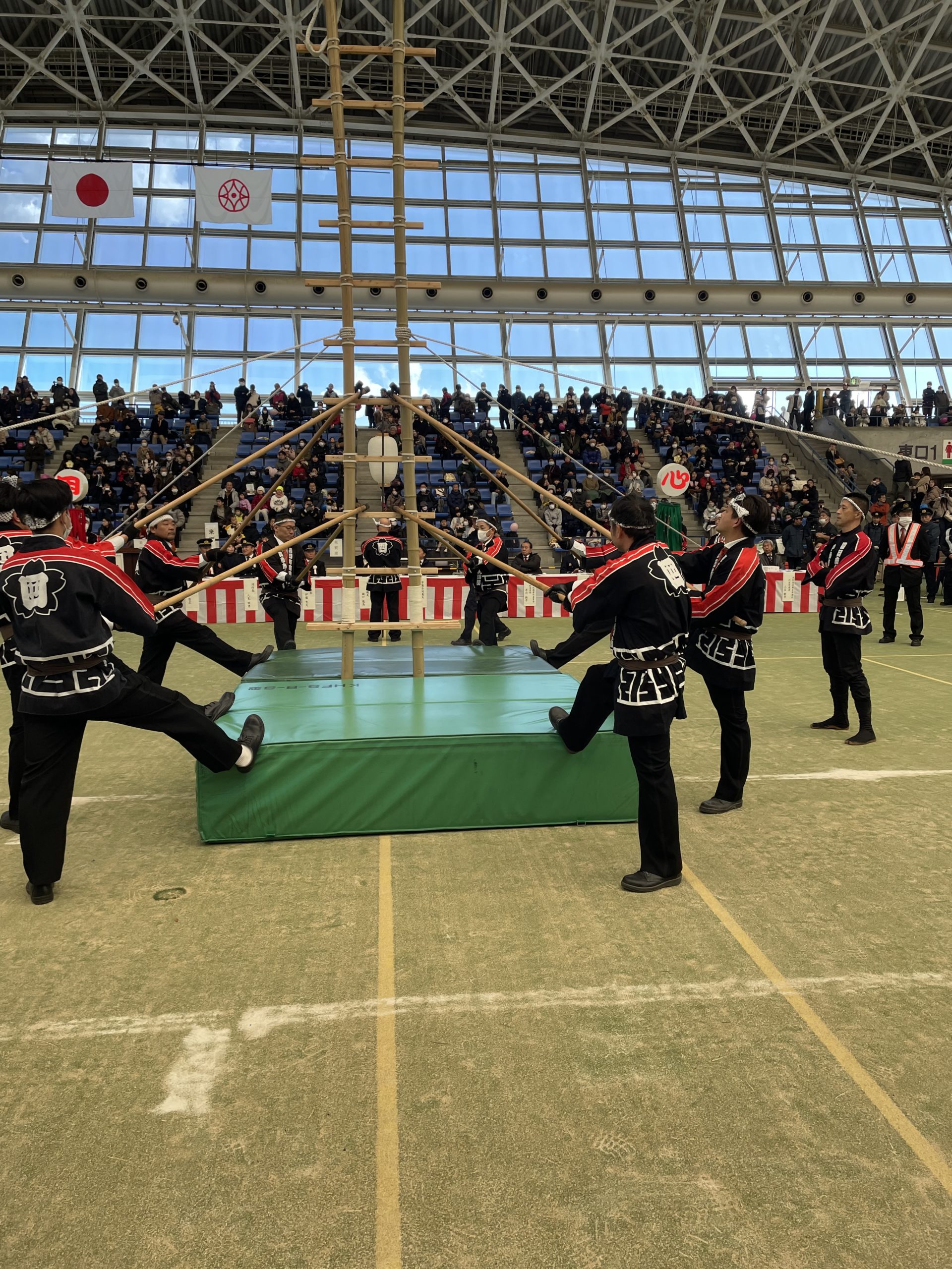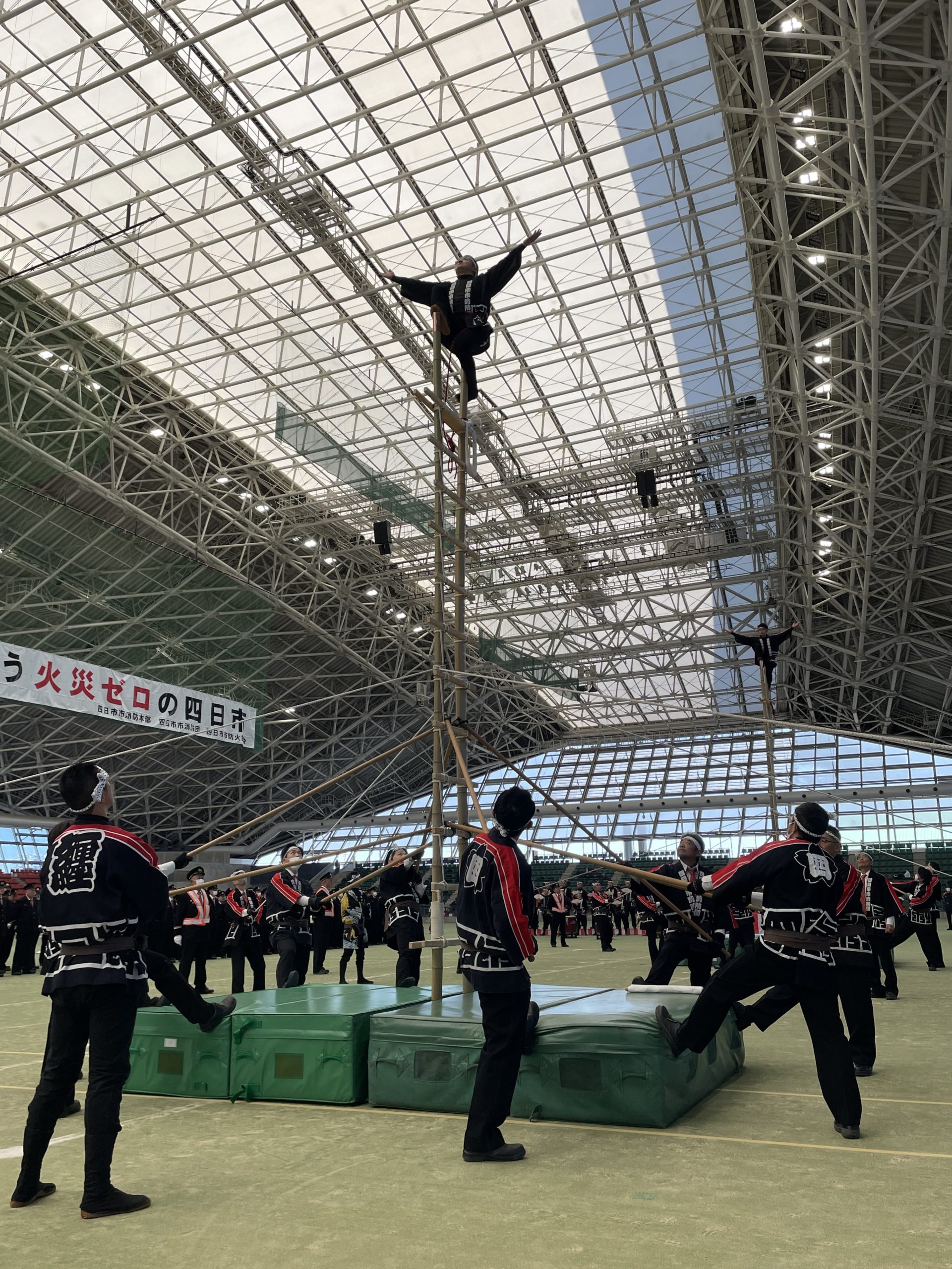 支えも梯子が傾かないように微調整を行い、乗り手をサポート。太鼓の演奏もとても迫力がありました。