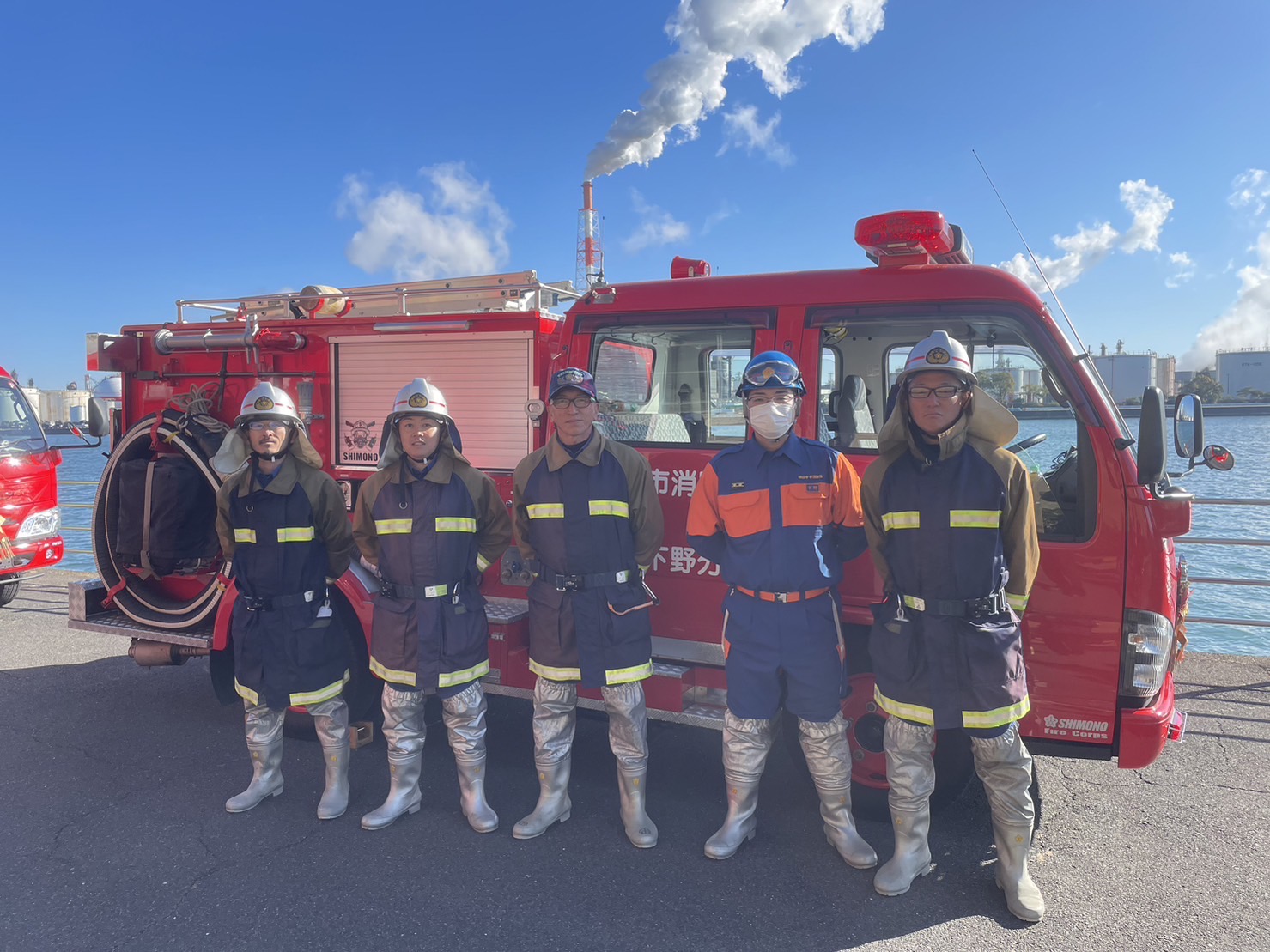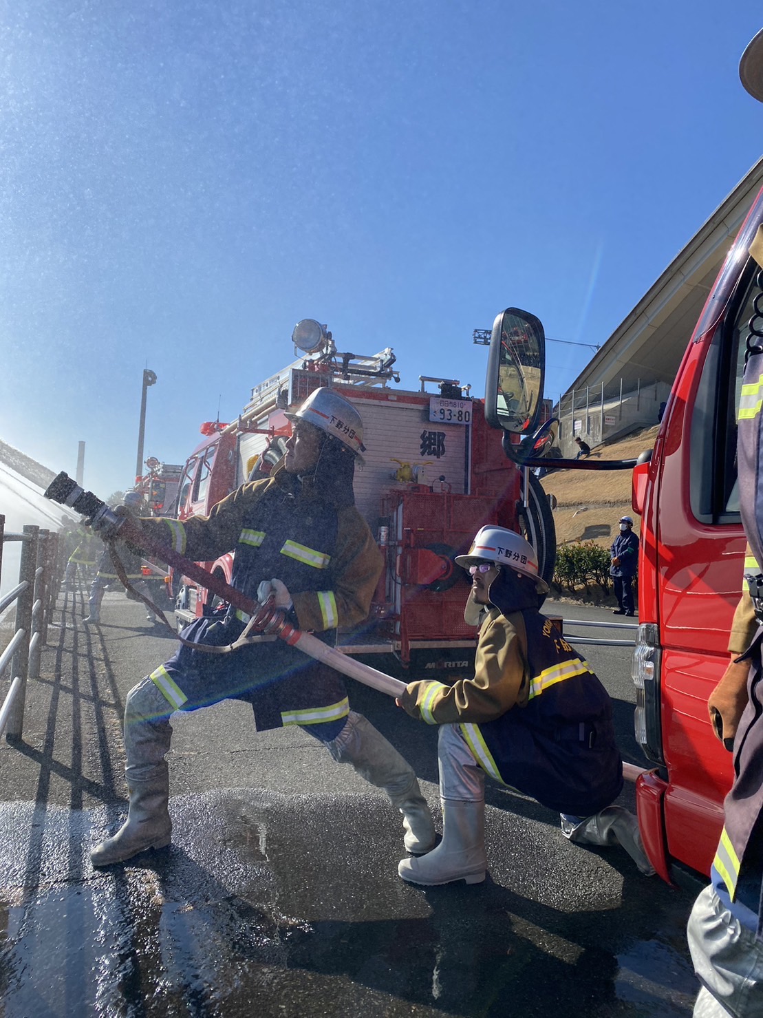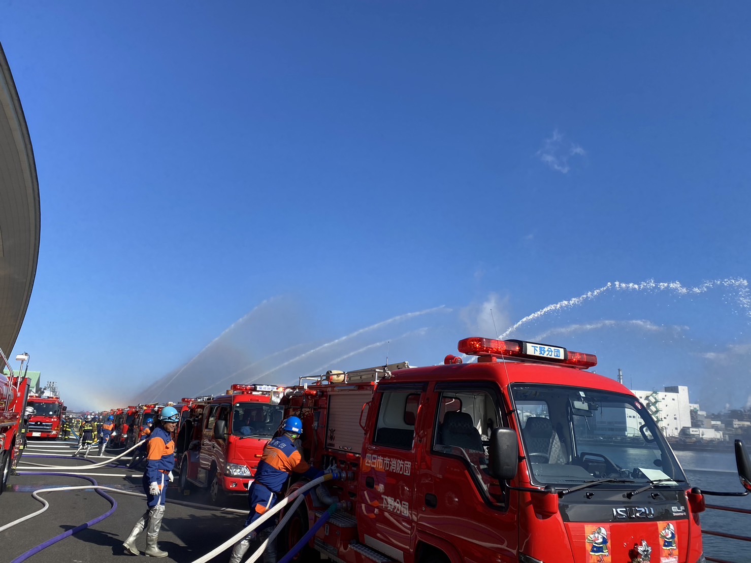 天候にも恵まれ、消防車両が並び一斉放水を行いとても綺麗な放物線を描いていました。