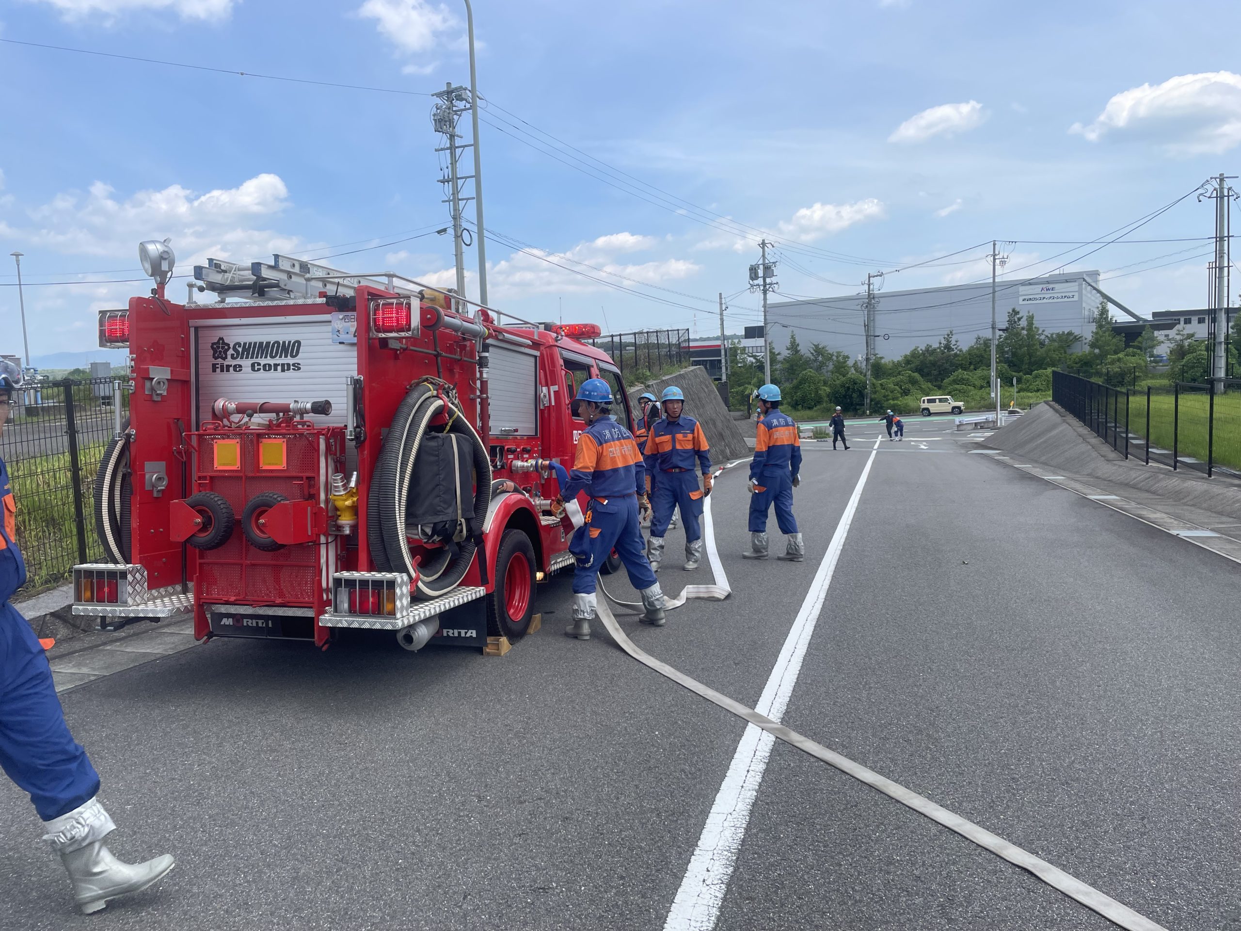 7分団が一定な距離を取って停車し、下野分団は中間位置の為、水利部署側の分団車両より筒先側の分団車両へ送水を行いました。
