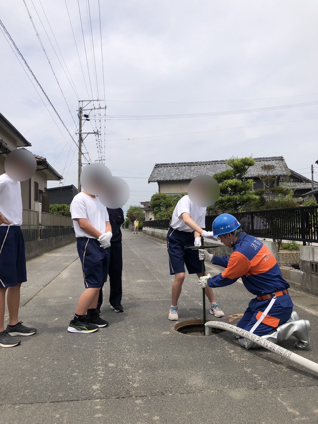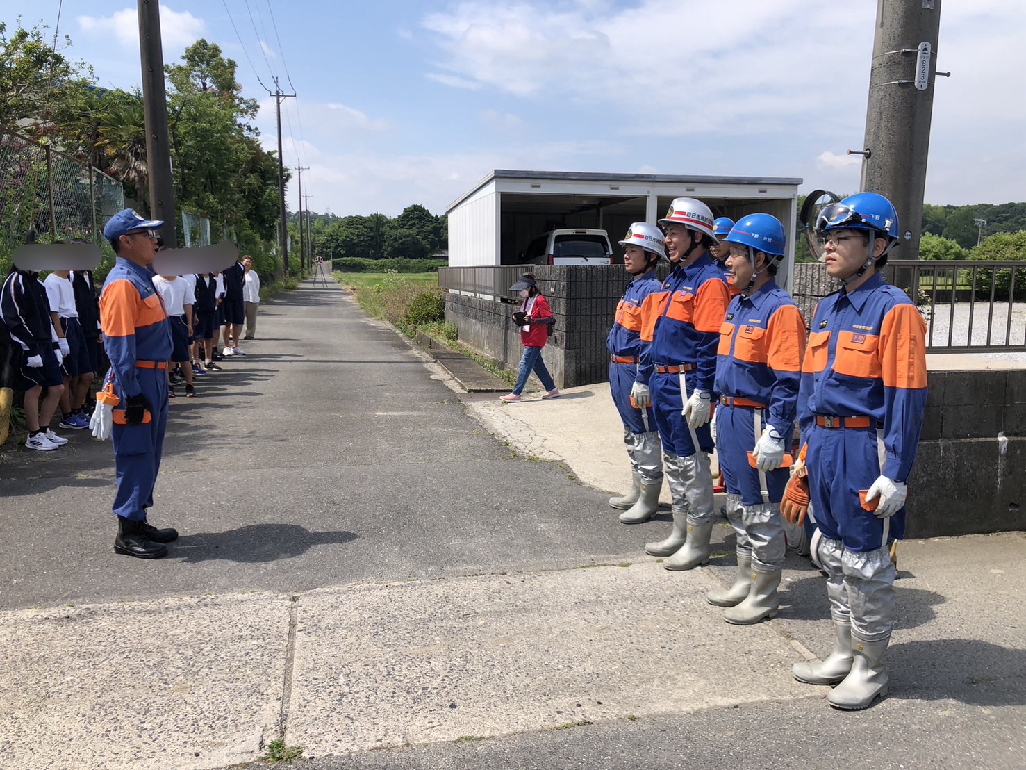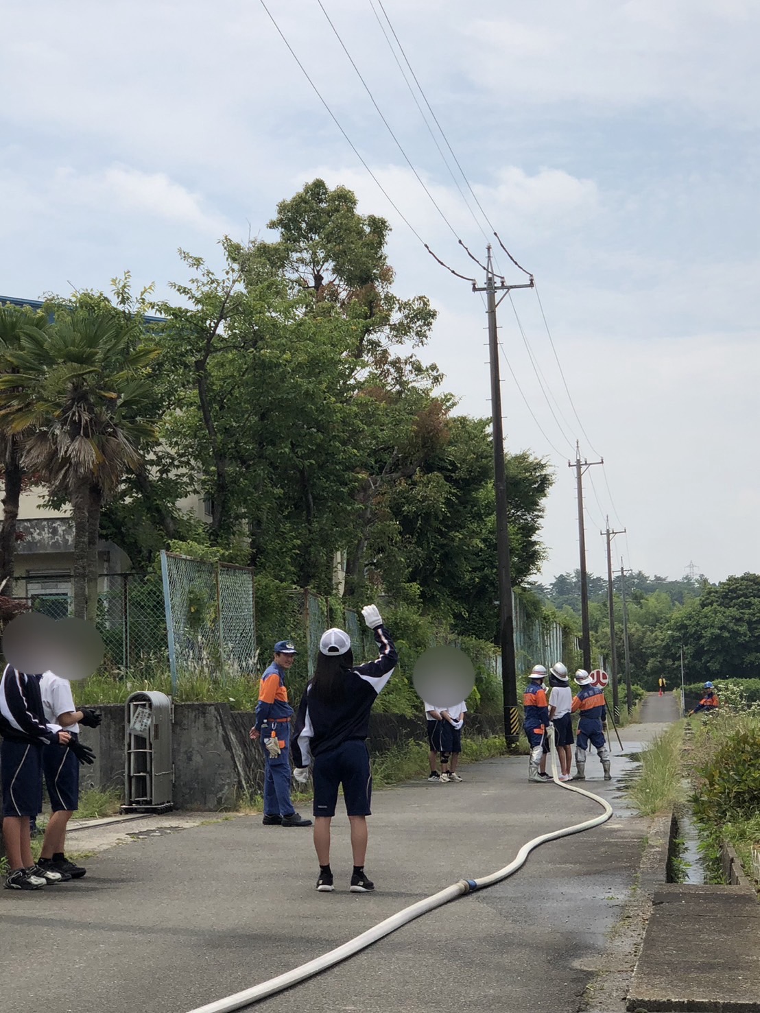展示後3班に分かれ、各班で放水、伝令、水元の三箇所を交代で学生が体験するのを補助しました。