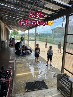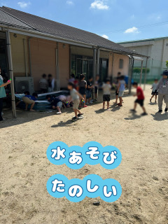 夏の自然にいっぱいふれ 体の変化に気をつけ、汗いっぱい戸外で水遊を楽しんでいます。