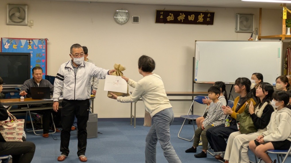 景品渡しの様子です。中身は開けてからのお楽しみ!?お目当ての景品なのか?そうでないのか・・・?